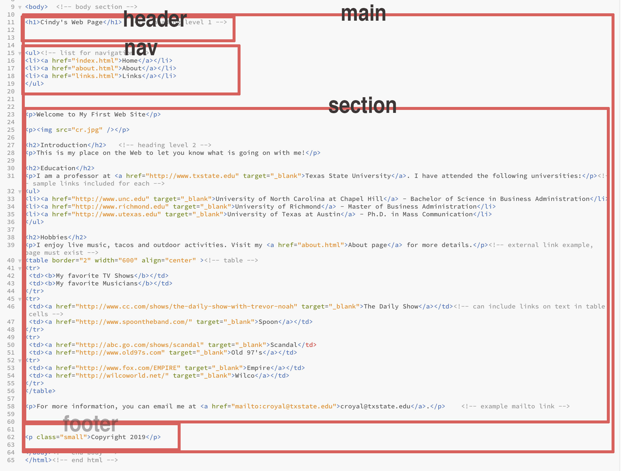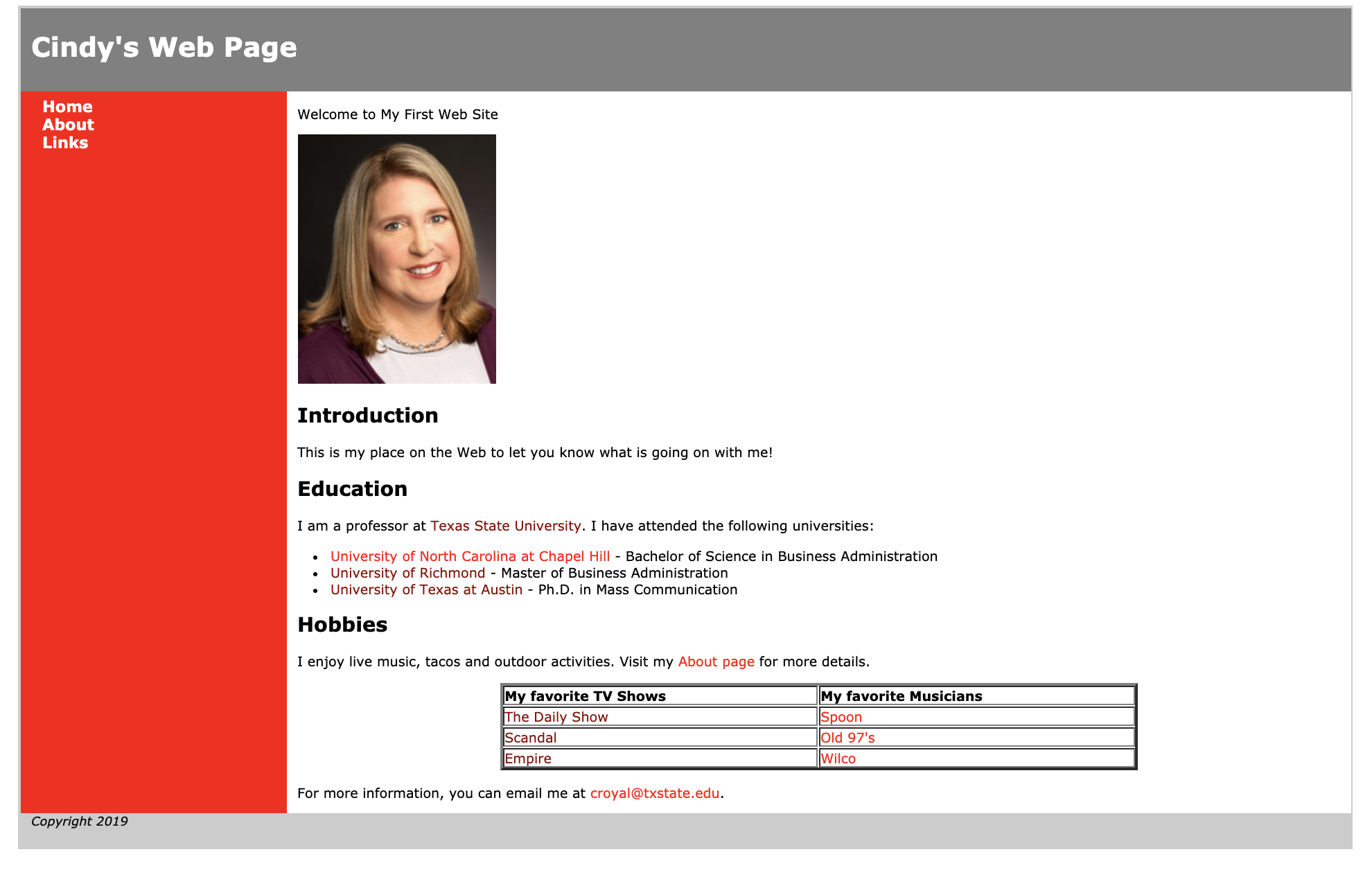 Now create the divs on the html page to correspond to what is in the stylesheet. Make sure all content goes in a div. The code below includes html comments to indicate where the divs begin and end, but this code does not affect how the page looks. It just makes it easier to be sure you have closed all divs that have been opened. Paying attention to closing divs will become more important as we have nested divs in more complex layouts.