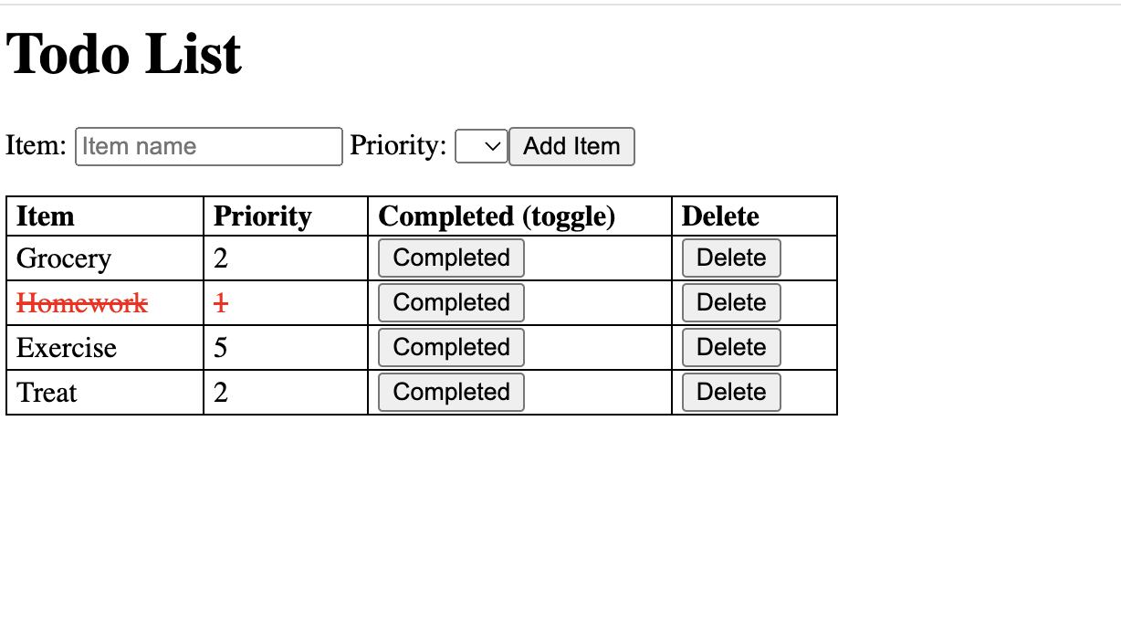 Your app should look like this after you submit a few sample items and try the Completed (X) feature. Also test the Delete feature.