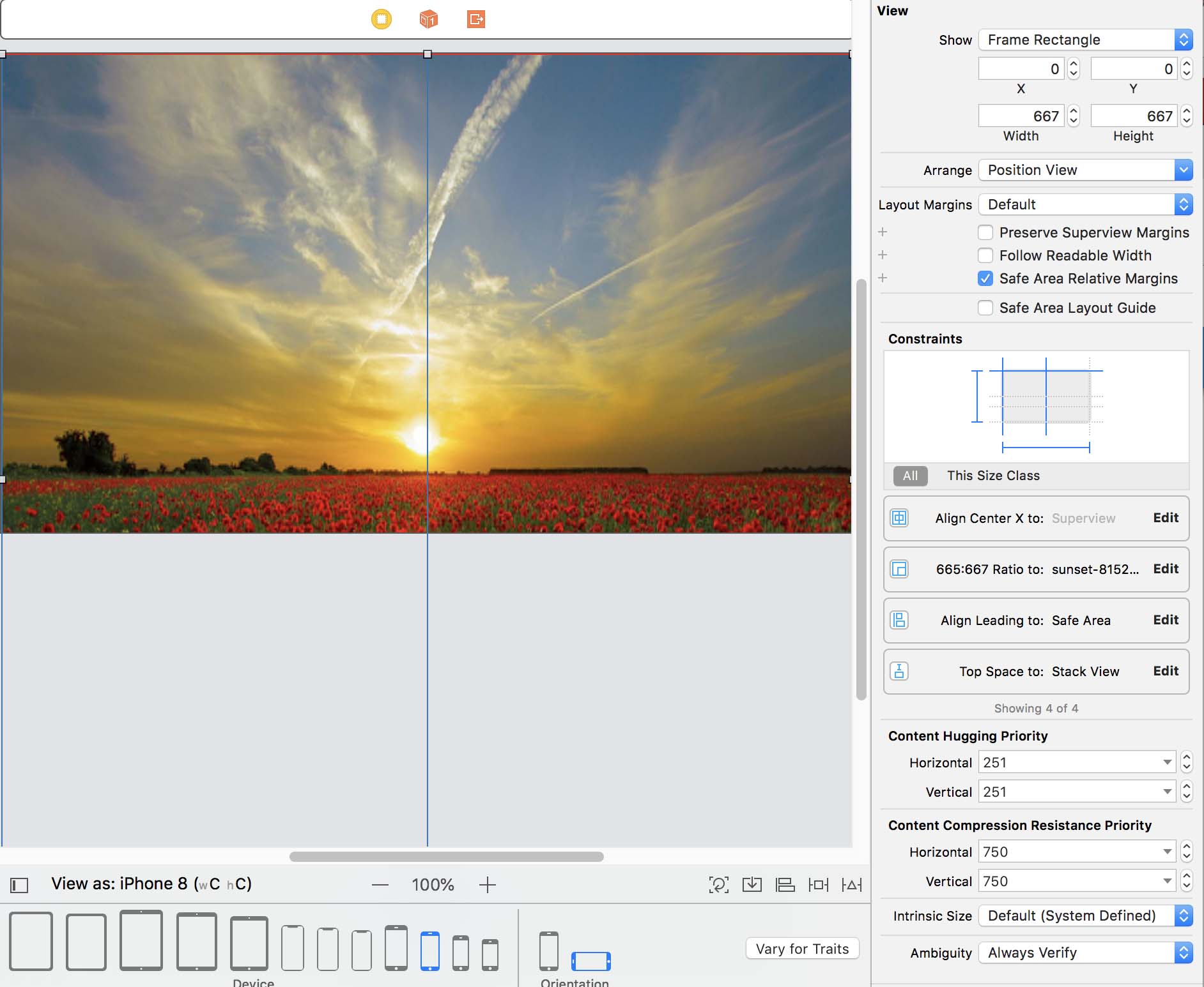 3. Establish the Aspect Ratio of the image. You can do this in the Add Constraints icon or by ctrl-click. Use the Align button to center the image horizontally. This will allow it to be place properly at portrait or landscape views.