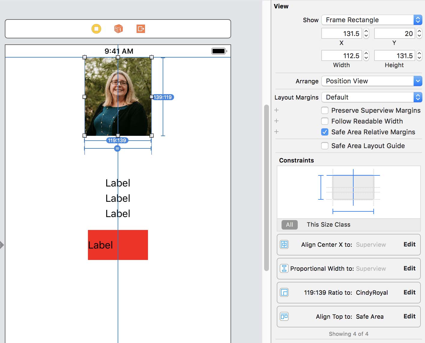 1. Find an image, like a headshot and drag it to the assets folder. Here's one you can use or download another. Move it to an ImageView. We want to do the same steps as above, except changing the Multiplier for Equal Widths to 0.30 and only establishing the top spacing.