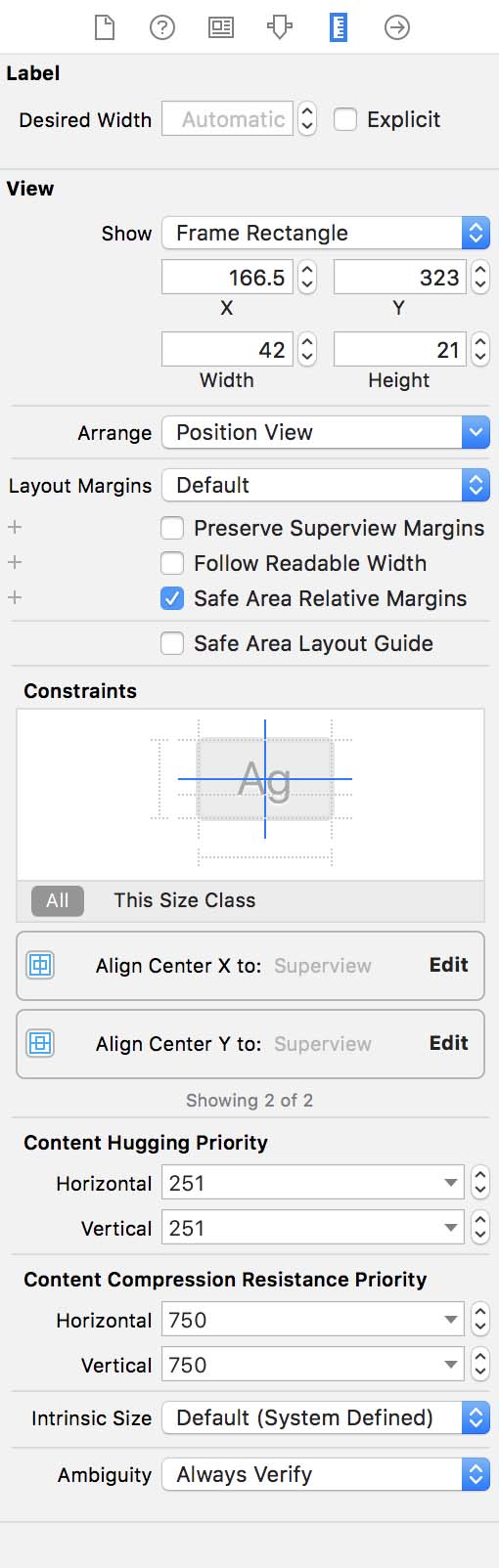 Notice the blue lines that were created to indicate the Constraints. If you click on the Size Inspector, you can see the Constraints that were added.