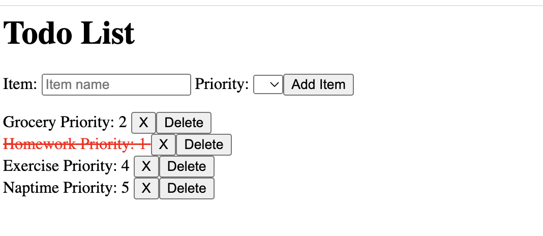 Your app should look like this after you submit a few sample items and try the Completed (X) feature. Also test the Delete feature.