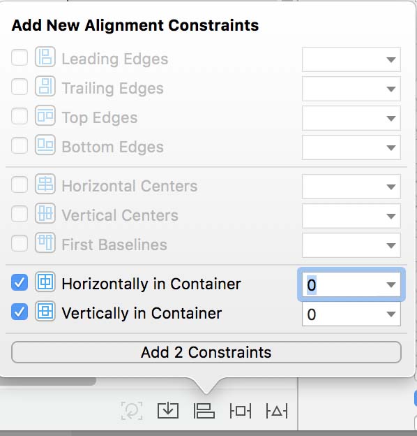 Find the alignment icons at the bottom of the XCode screen. See the image to the right.