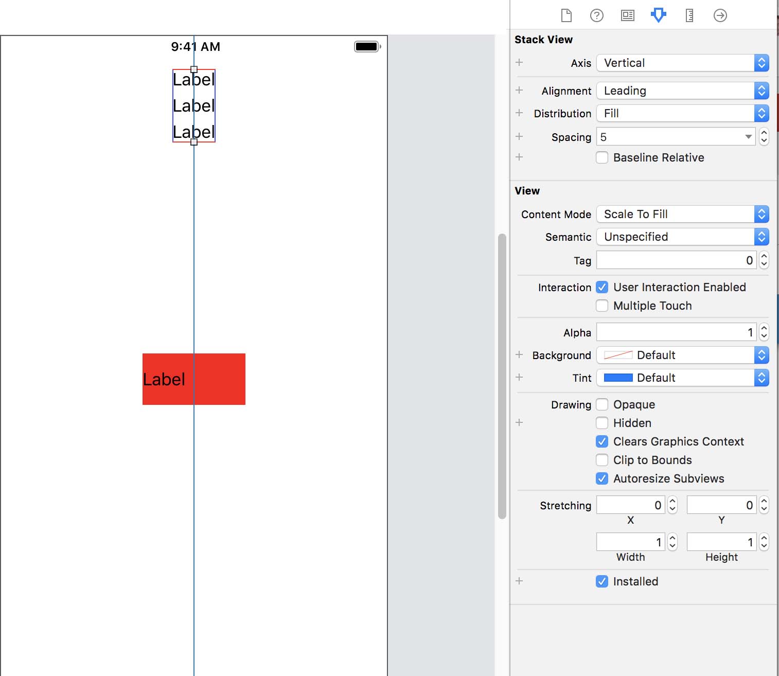 Notice the blue lines that were created to indicate the Constraints. If you click on the Size Inspector, you can see the Constraints that were added.